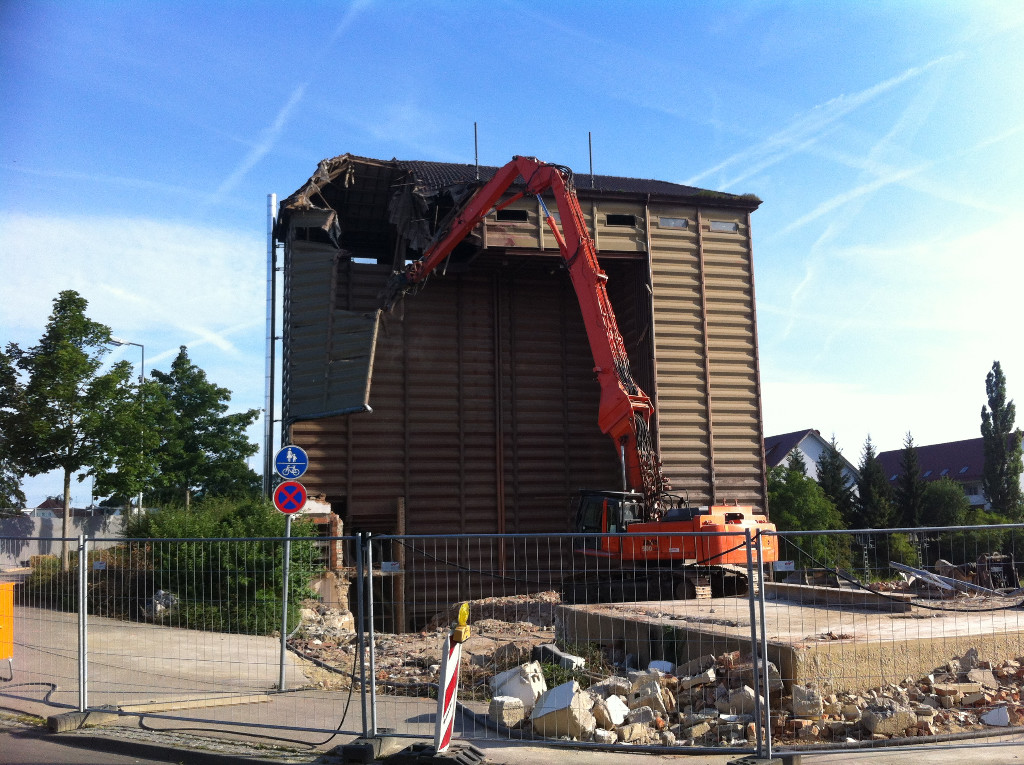 Seit Anfang Juni 2012 ist die KS Engineering GmbH mit umfangreichen Entkernungs- und Sanierungsarbeiten mit anschließendem maschinellen Rückbau von insgesamt ca. 19.500 m³ UBR mittels 35to-Kettenbagger auf dem ehemaligen BayWa-Areal in Ehingen beschäftigt. Ein Teil des Gebäudekomplexes mit einer Höhe von ca. 25 m wird seit KW 28 mit einem Longfront-Kettenbagger selektiv zurückgebaut.