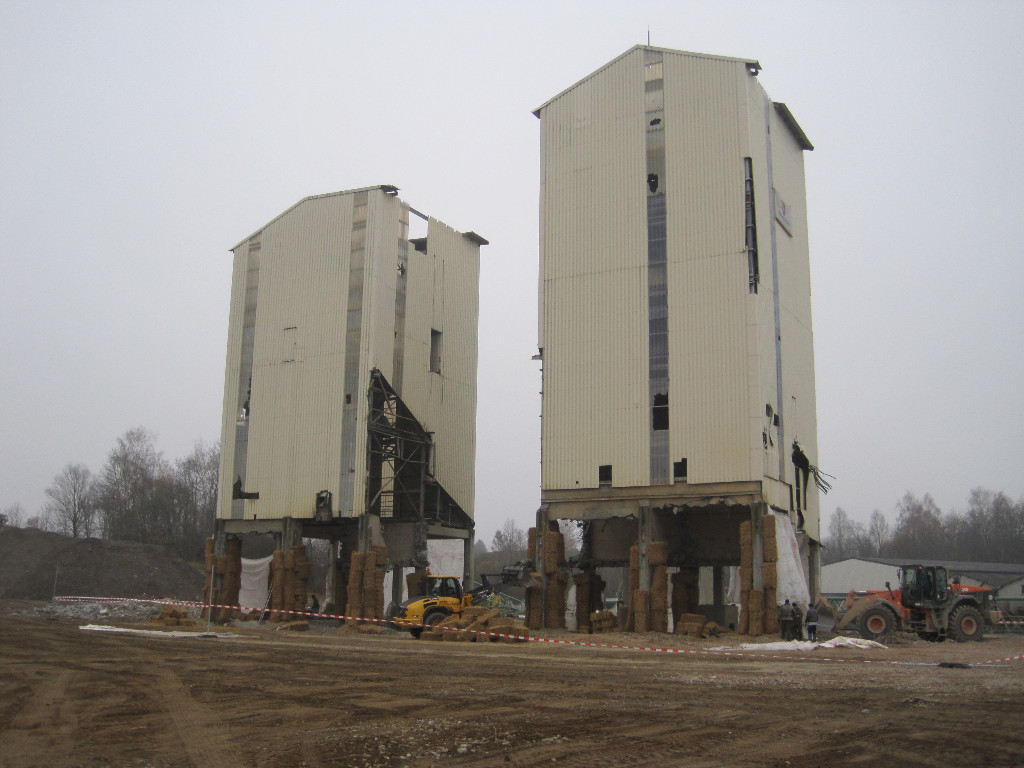 Im November 2012 erhielt die KS Engineering GmbH den Auftrag das ehem. Moränekieswerk in Laupheim rückzubauen. Die KS Engineering GmbH begann in KW 45 mit den vorbereitenden Abbrucharbeiten, die Sprengungen fanden druch eine Spezialfirma am 19. und 20.11.2012 statt. Hierbei wurde sogar eine kurzfristige Lokalattraktion – Der schiefe Turm von Laupheim – geschaffen. Dieser entstand dadurch, das nur die unten liegenden Betonstützen mit Sprengmaterial beladen werden konnten und die darauf liegende hohle Stahlkonstruktion so leicht war, dass diese nicht genug Schwung zum Sturz erhalten konnte. Jedoch wurde dies schnell durch einen gezielten Meißeleinsatz unseres Hydraulikkettenbaggers behoben. Die Arbeiten wurden planmäßig in KW 48 erfolgreich abgeschlossen.